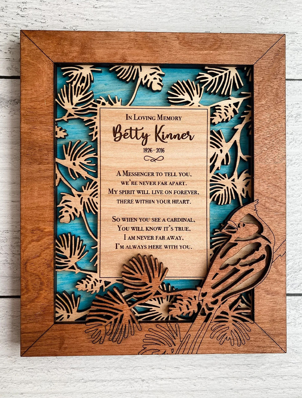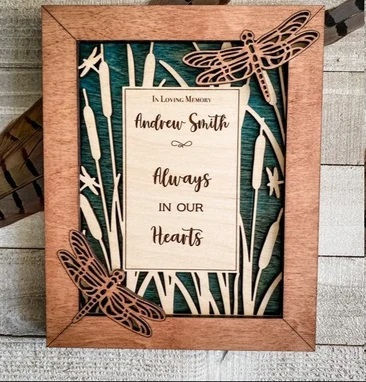 Creating a memorial piece is a great way to honor a departed loved one. First, choose the style of memorial that you want, then select a pattern or faux wood from the palette options for the backer of the plaque. Consider the colors or items that they liked in life, or maybe one that speaks to you and your memories.